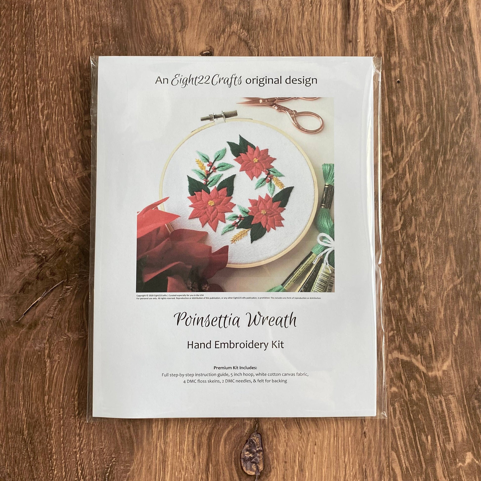 Our "Poinsettia Wreath" embroidery kit is perfect for beginners and experienced stitchers alike. CONTENTS - Full step-by-step photo instructions - Pre-printed white canvas fabric - 4 inch hoop - 3 full skeins DMC floss, 1 skein DMC etoile - 2 needles of different sizes - Needle threader - Felt for backing Copyright © 2020 Eight22Crafts, September Ashley