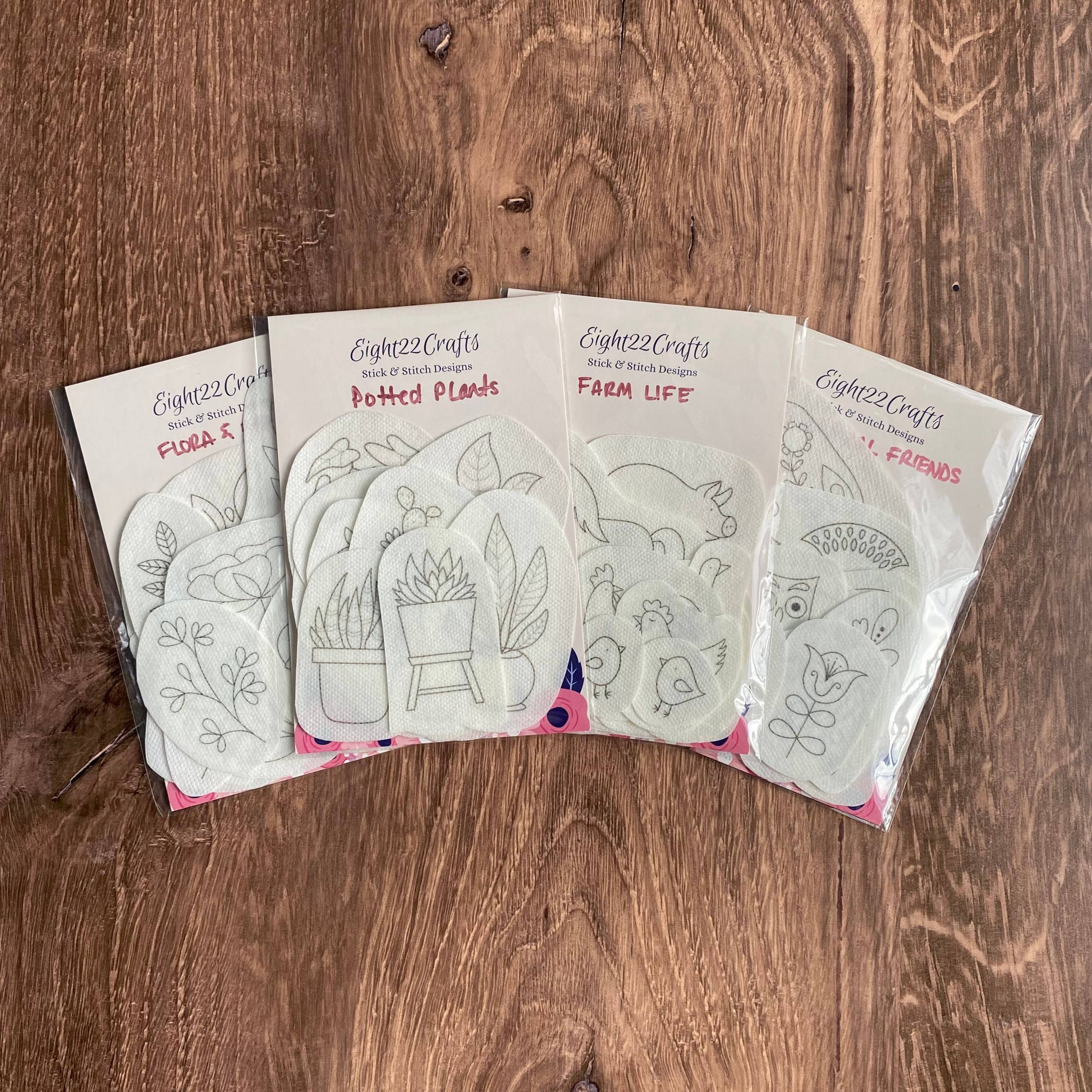 Each stick and stitch pack comes with adhesive water soluble designs that can be used to embellish clothing, bags, purses, kitchen linens, socks, etc! Currently available in 4 unique collections: - Flora & Fauna (15 designs) - Whimsical Friends (15 designs) - Potted Plants (12 designs) - Farm Life (20 designs) Each design is printed onto Sulky Solvy water soluble stabilizer and can only be used one time. Packaging provides simple instructions (back side) explaining how to use these stick and stitch patches.