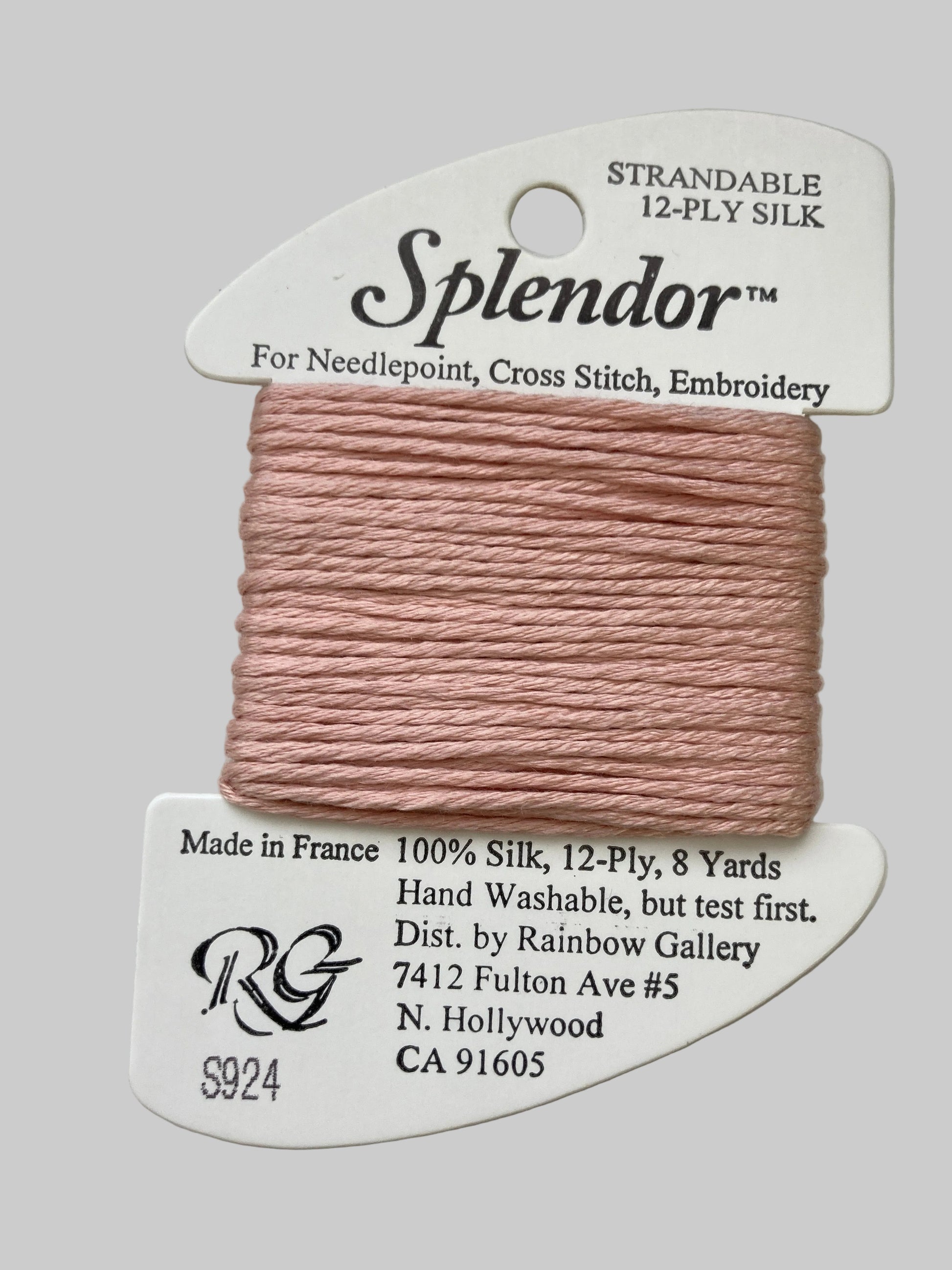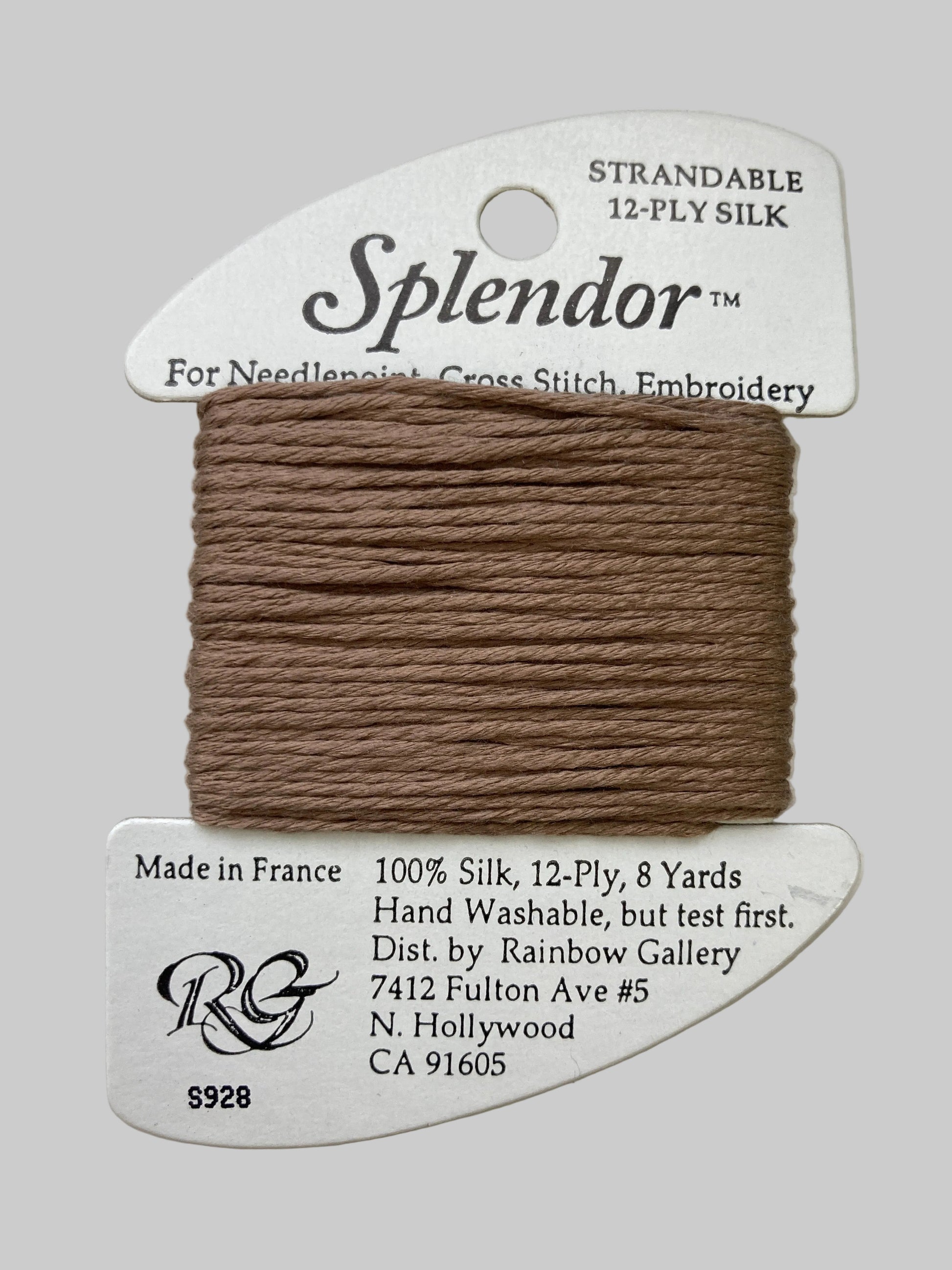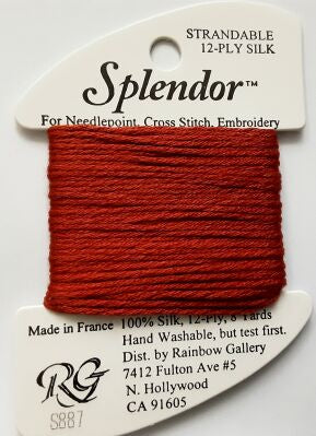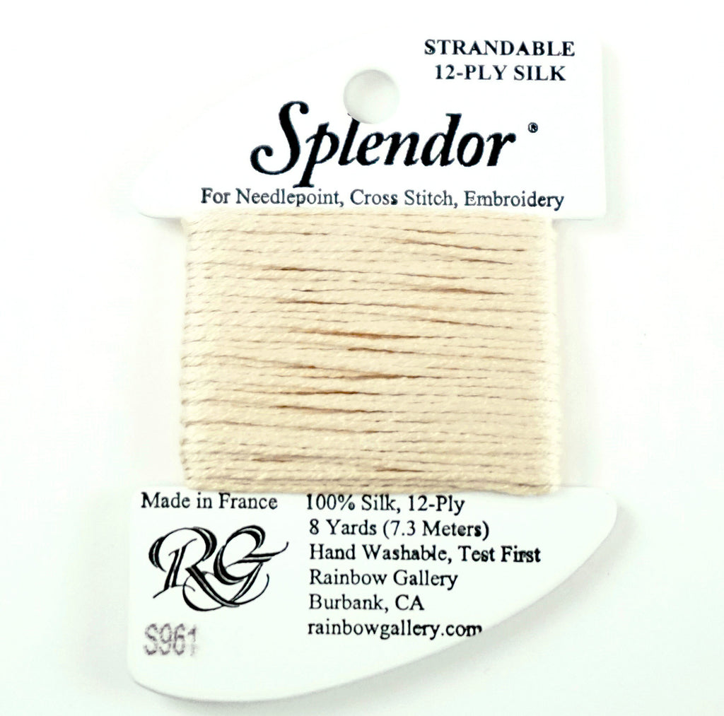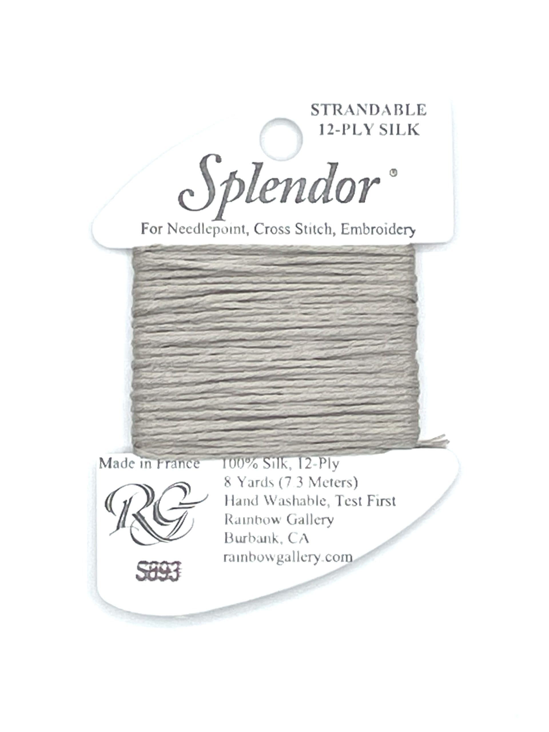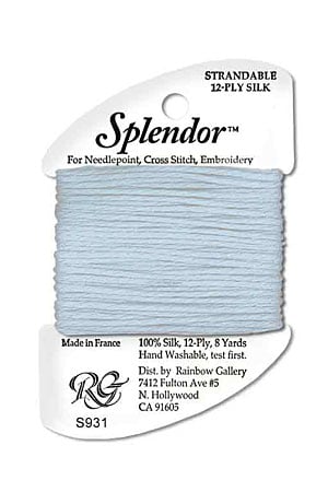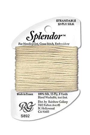 A 12-ply silk that is composed of three 4-ply bundles twisted together. The twist of each individual strand is tighter than most silks making it easier to use. Many of the usual problems experienced with silk will not occur with Splendor. Anyone that stitches with cotton floss will have no problem with it. Dyed to match many of the Splendor colors are Splendor Silk Ribbon, Grandeur, Elegance, and Subtlety.